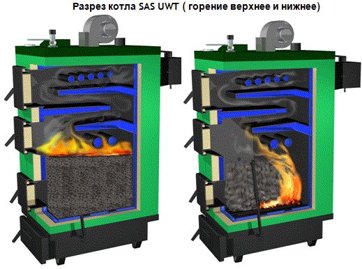 Котел SAS UWT это устройство адаптированное для работы с верхним и нижним сжиганием твердого топлива.